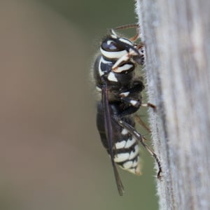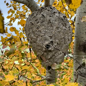 The bald-faced hornet is distinguished from other yellowjackets by its white and black coloring. It has a white or "baldfaced" head, which is the source of its colloquial name. This wasp also has three white stripes at the end of its body and is notably larger than other species of Dolichovespula, as adults average about 0.75 in in length. Queen and worker wasps have similar morphologies. Queens are always larger than workers in their colonies, though size distributions can vary in different nests, and workers in one colony might be as large as a queen in a different one. D. maculata creates egg-shaped, paper nests up to 14 in in diameter and 23 in in length. Nests are layered hexagonal combs covered by a mottled gray paper envelope. Bald-faced hornets create this paper envelope by collecting and chewing naturally occurring fibers. The wood fiber mixes with their saliva to become a pulpy substance that they can then form into place.