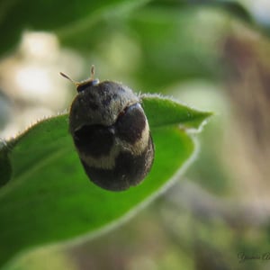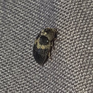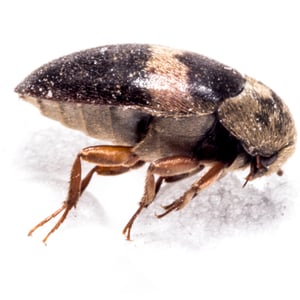 Attagenus fasciatus, commonly known as the carpet beetle, is a small insect belonging to the family Dermestidae. It is approximately 3-5 mm in length and has a distinctive pattern of alternating light and dark bands on its elytra. The larvae of A. fasciatus are known to be destructive pests, feeding on a variety of organic materials such as carpets, upholstery, and clothing. They are commonly found in homes and can cause damage to household items if left unchecked.