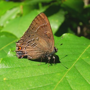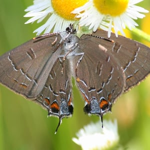 The banded hairstreak is a common hairstreak east of the Rocky Mountains in North America. It is a territorial butterfly that will challenge other butterflies invading its territory.