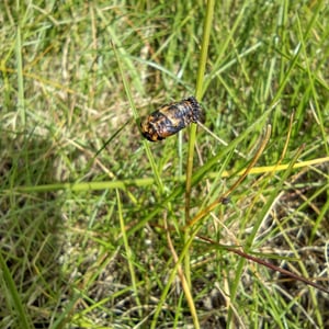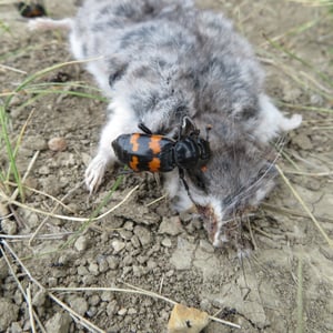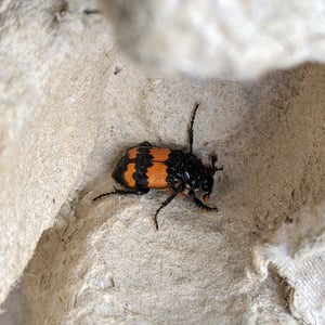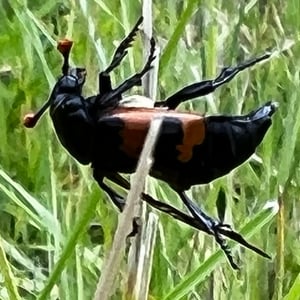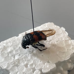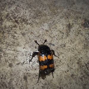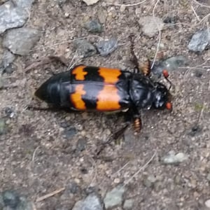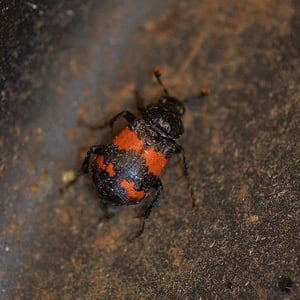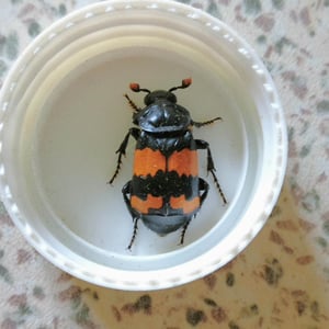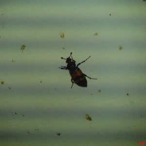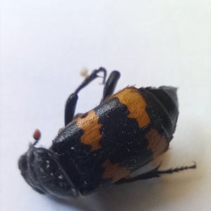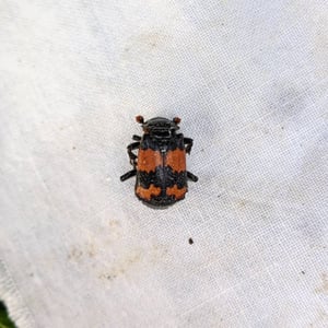 Nicrophorus investigator, commonly known as the burying beetle, is a species of insect belonging to the family Silphidae. These beetles are known for their unique behavior of burying small vertebrate carcasses, such as birds or rodents, as a food source for their larvae. They have a black or dark brown body with orange markings and are typically around 1 to 1.5 centimeters in length. Burying beetles play an important role in ecosystem decomposition and nutrient recycling.