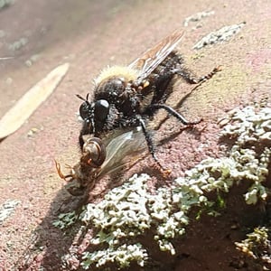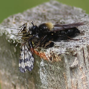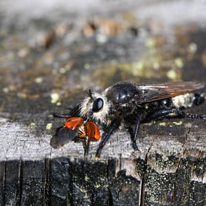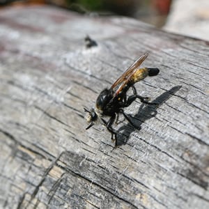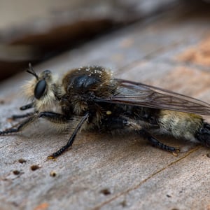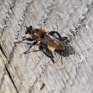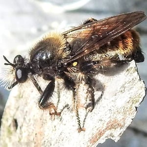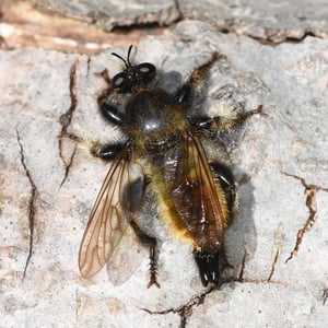 Laphria is a genus of large, robust flies belonging to the family Asilidae, commonly known as robber flies. These insects are characterized by their stout bodies, bristly appearance, and strong predatory behavior. Laphria species are known for their impressive hunting skills, capturing other insects in mid-air with their sharp mouthparts. They are often found in open habitats such as meadows and grasslands, where they play an important role in controlling populations of other insects.