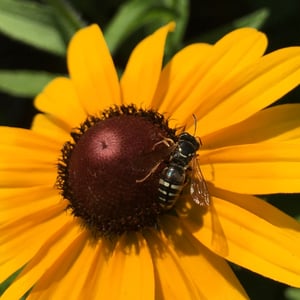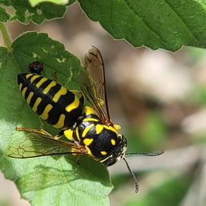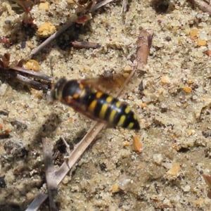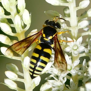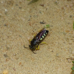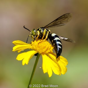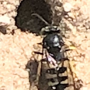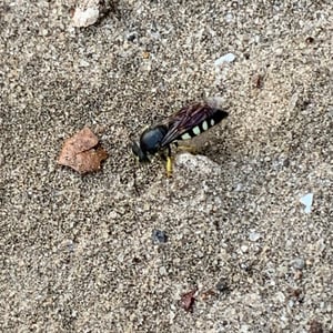 Bicyrtes is a species of solitary wasp commonly found in North America. It belongs to the family Crabronidae and is known for its distinctive black and yellow coloration. Bicyrtes is a parasitic wasp that preys on various species of beetles, particularly those that infest wood. The female Bicyrtes captures beetles, paralyzes them with her venom, and then lays her eggs on the immobilized prey, providing a food source for her developing larvae.