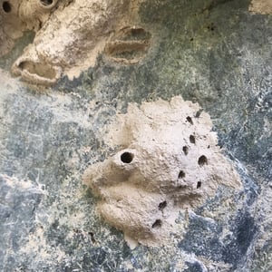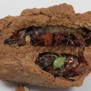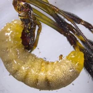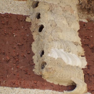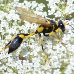 The black and yellow mud daubers are solitary parasitoid wasps that build nests out of mud. These sphecid wasps collect mud balls at puddle and pool edges for constructing nests. Frequently, nests are built in shaded areas inside formations that are sheltered from the weather or from other environmental elements. These sites may be naturally-occurring, or man-made structures. Some examples are: under and inside various types of bridges, barns, garages, open-air porches, or under housing eaves. The nests comprise up to 25 vertically arranged, individual cylindrical cells. After initial creation and covering of the clutch, this sphecid wasp uses more mud as a means covering and protecting the whole cluster of cells, thereby forming a smooth appearance, and a uniform nest. The entire nest may attain an area equal to, or larger than, the size of an average human fist. After building a cell of the nest, the female wasp captures several spiders. The captured prey are stung and paralyzed before being placed in the nest (usually 6-15 per cell), and then a single egg is deposited on the prey within each cell. The wasp then seals the cell with a thick mud plug. After finishing a series of cells, she leaves and does not return. The larva spins a cocoon and pupates. Eventually, the hatching larva will eat the prey and emerge from the nest. Adults can be seen in mid-summer feeding on nectar at flowers, especially Queen Anne's lace (Daucus carota), parsnips and water parsnips (Sium suave, Sium latifolium, Berula erecta). They have a low reproductive rate. Stings are rare due to their usually peaceful nature, however nests are aggressively defended. A common species of cuckoo wasp, Chrysis angolensis, is frequently a cleptoparasite in Sceliphron nests, and is only one of many different insects that parasitize these mud daubers. Venom Although they are common components of venoms, serotonin, histamine, acetylcholine, and kinins are absent from S. caementarium venom.