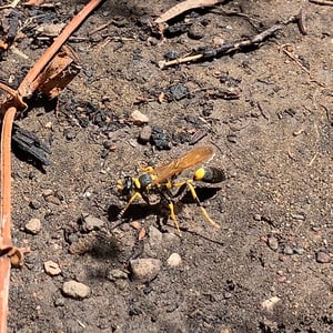 Sceliphron caementarium, also known as the yellow-legged mud-dauber wasp, black-and-yellow mud dauber (within the US), or black-waisted mud-dauber (outside of the US), is a species of sphecid wasp. There are some 30 other species of Sceliphron that occur throughout the world, though in appearance and habits they are quite similar to S. caementarium.