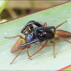 They also change from vision-based courtship in the open to vibratory courtship when mating inside a rolled-up leaf. If an immature female is within about ten days of maturing, the male will live with her for this time and then mate inside the leaf. The two are in physical contact for a while after mating, and communicate using tactile signals. Upon entering a rolled-up leaf, both sexes will tap the leaf surface with the first pair of legs and vibrate their abdomen.