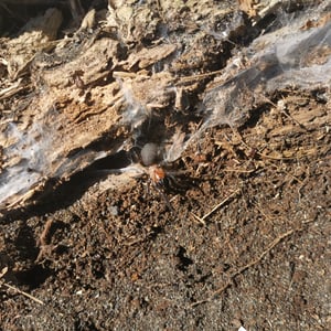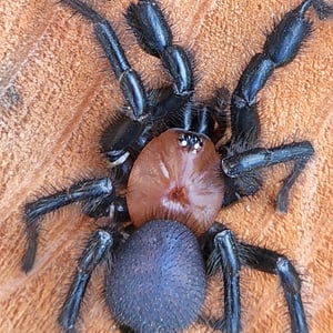 In females, the carapace is usually coloured yellow or orange black with some shading near the eyes. The legs and palps are also typically orange brown, but are darker than the carapace. The chelicerae are reddish brown (sometimes black). The sternum is a pale reddish brown. The abdomen is a uniform purple black colour and may have faint chevron patterns, more noticeable in juveniles. The opening of the two pairs of book lungs are ringed with cream. Females are the larger of the two sexes. Body size is variable, but can exceed 30 mm. In males, the carapace is darker than in females. The legs and palps are a dark reddish brown. The chelicerae are also dark reddish brown and sometimes black. The abdomen is also coloured similarly to that of females. Males can be distinguished from females by the presence of clasping structures in the first pair of legs which are used to hold females during copulation. Porrhothele antipodiana is often confused with species from the genus Hexathele, which occupies similar habitat and builds similar webs. They can be distinguished by the number of spinnerets (Porrhothele has two sets of spinnerets whereas Hexathele has three sets). As the common name suggests, these spiders construct non-sticky long tunnel-shaped webs, often under logs and rocks, but they will also construct their webs in the trunks of trees, in rock faces and in urban structures. Tunnels may be up to 25 cm long and 3-4 cm wide, often with just a single opening where silk is widely spread out to catch and alert the spiders to the presence of prey. Webs for tunnels can be spun as quickly as within one hour.