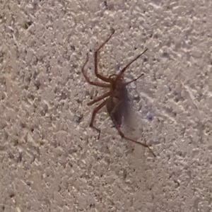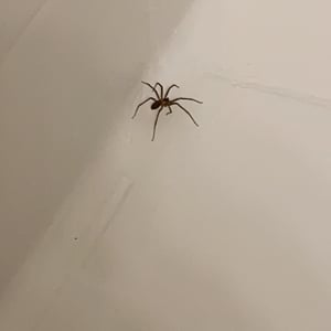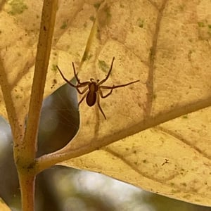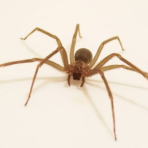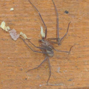 The violin pattern is not a definitive identifier, as other spiders can have similar markings (e.g. cellar spiders and pirate spiders). Instead, while most spiders have eight eyes, recluse spiders have six eyes arranged in pairs (dyads) with one median pair and two lateral pairs. Only a few other spiders have three pairs of eyes arranged in this way (e.g., scytodids). Recluses have no obvious coloration patterns on the abdomen or legs, and the legs lack spines. The violin marking can vary in intensity depending on the age of the brown recluse spider, with mature spiders typically having dark violin shapes.