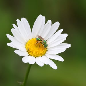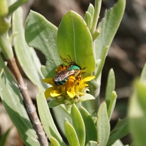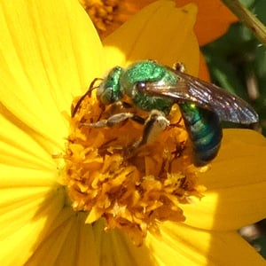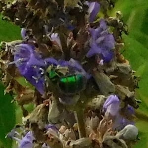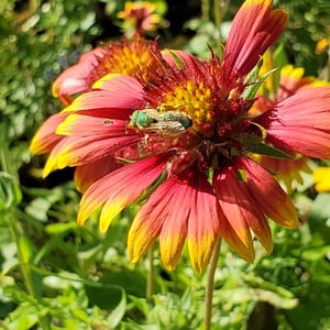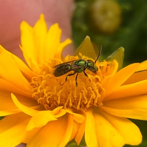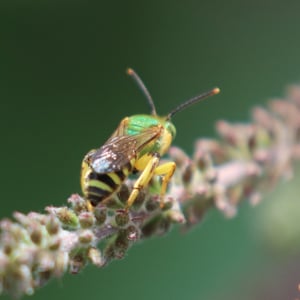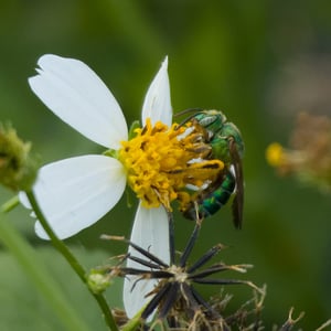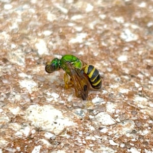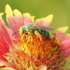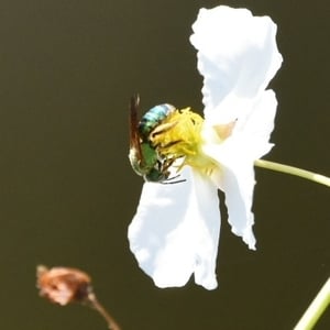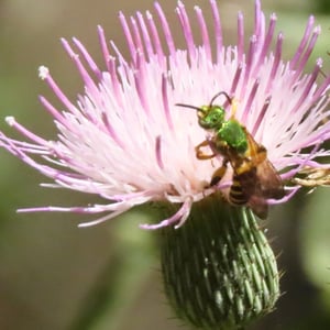 Agapostemon splendens, commonly known as the splendid green sweat bee, is a species of solitary bee found in North America. It is known for its striking metallic green coloration, which distinguishes it from other bees. These bees are important pollinators, visiting a wide range of flowers for nectar and pollen collection. They are often found nesting in the ground, creating small burrows for their offspring.