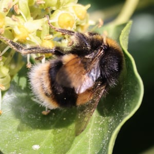 B. terrestris are pollen-storing bees that generally feed and forage on nectar and pollen. The queen is between 20 and 22 mm long, males range from 14 to 16 mm, and workers from 11 to 17 mm. Workers have white-ended abdomens, and look just like workers of the white-tailed bumblebee, B. lucorum, a close relative, apart from the yellowish bands of B. terrestris being darker in direct comparison. The queens of B. terrestris have the namesake buff-white abdomen tip ("tail"); this area is white as in the workers in B. lucorum. B. terrestris is unique compared to other bees in that their caste of workers exhibit a wide variation in worker size, with thorax sizes ranging from 2.3 to 6.9 mm in length and masses ranging from 68 to 754 mg.