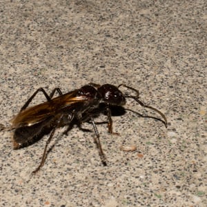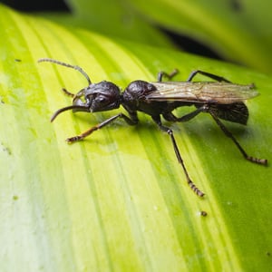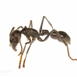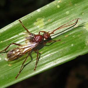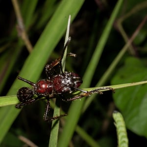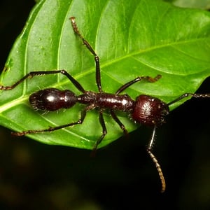Worker ants are 18 – long and resemble stout, reddish-black, wingless wasps. Paraponera is predatory, and like all primitive poneromorphs, does not display polymorphism in the worker caste; the queen ant is not much larger than the workers. They are not aggressive ants but are vicious when defending the nest, when they produce a stridulating sound and sting with ferocity.
