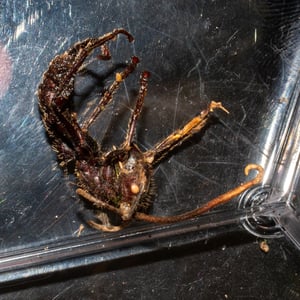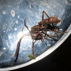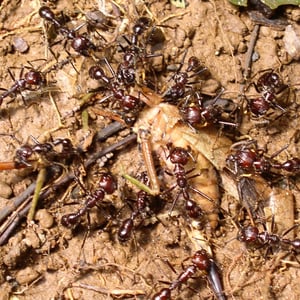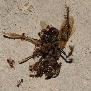 The small (1.5- to 2.0-mm-long) phorid fly, Apocephalus paraponerae, is a parasite of injured workers of P. clavata, of which the supply is constant because frequent aggressive encounters occur between neighbouring colonies, resulting in maimed workers. The flies are able to parasitise healthy ants if the ants are artificially restrained, but healthy ants are agile and able to repel them. Both male and female flies are attracted by the scent of injured ants; the females lay eggs, as well as feed, and the males feed and possibly mate with the females. The flies are attracted to a crushed ant within two to three minutes and 10 or more flies may be attracted to each ant. Each ant can harbour 20 fly larvae. Carl Rettenmeyer observed P. clavata actively trying to attack A. paraponerae when they approached the entrance to their nest.