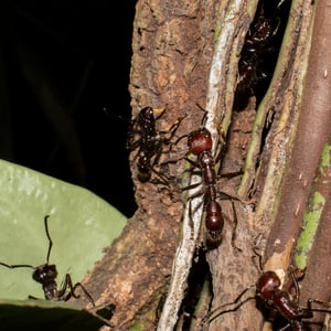 Colonies consist of several hundred individuals and are usually situated at the bases of trees. Workers forage arboreally in the area directly above the nest for small arthropods and nectar, often as far as the upper canopy; little foraging occurs on the forest floor. Nectar, carried between the mandibles, is the most common food taken back to the nest by foragers. Two studies in Costa Rica and on Barro Colorado Island (BCI) found about four bullet ant nests per hectare of forest. On BCI, the nests were found under 70 species of trees, six species of shrubs, two species of lianas, and one species of palm. Nests were most common beneath the canopies of Faramea occidentalis and Trichilia tuberculata, but these trees are also the most abundant in the forest. Nests were present more frequently than would be expected based on the abundance of the trees under Alseis blackiana, Tabernaemontana arborea, Virola sebifera, Guarea guidonia, and Oenocarpus mapora. The large number of nest plants suggests little active selection of nest sites by bullet ants. Small shrubs, however, are underused, probably because they do not provide access to the forest canopy. The study on BCI concluded that bullet ants may select trees with buttresses and extrafloral nectaries.