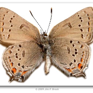 Satyrium californica, the California hairstreak, is a butterfly of the family Lycaenidae. It is found from British Columbia south to southern California and east to Colorado. The wingspan is 25–32 mm. The upperside is brown with an orange spot on the hindwings. The outer edge of the forewings usually has row of orange spots. The underside is brown-grey with orange crescents and a postmedian band of black spots. Each hindwing has two tails. Adults feed on the nectar of various flowers, including Eriogonum and Asclepias species. In Canada, the larvae feed on Cercocarpus, Salix species, buckbrush (Ceanothus spp.), antelope-brush (Purshia tridentata), oaks (Quercus spp.), cherry (Prunus spp.), and saskatoon (Amelanchier alnifolia). In California, they are noted to feed on oaks, Apocynum cannabinum, Marrubium species, Ceanothus velutinus, California buckeye, milkweed, and other plants. Adults are active April to September, depending on region. They overwinter as eggs.