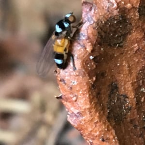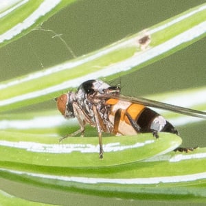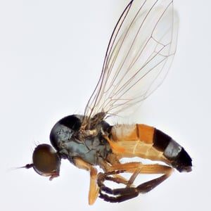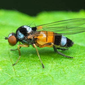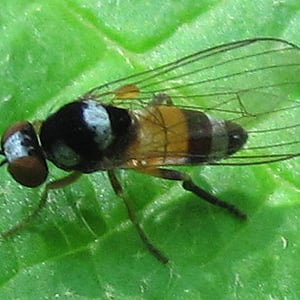 Callomyia venusta is a small, brightly colored insect belonging to the family Callomyiidae. It is commonly found in temperate regions, particularly in forests and meadows. This insect has a slender body with intricate patterns of yellow, orange, and black markings on its wings and thorax. Callomyia venusta is known for its agile flight and is often observed feeding on nectar from flowers.