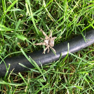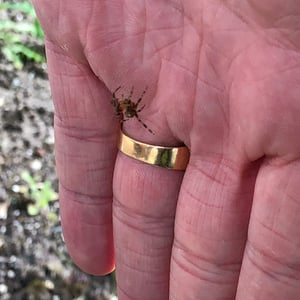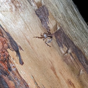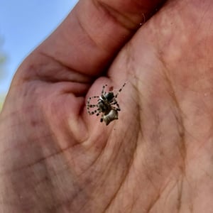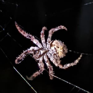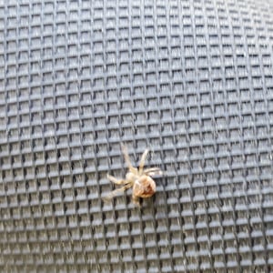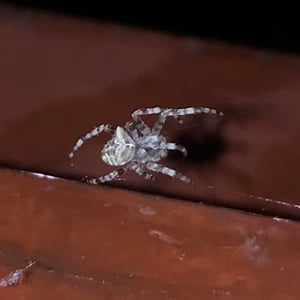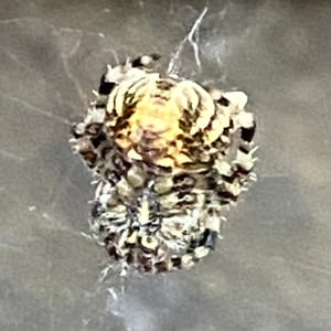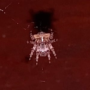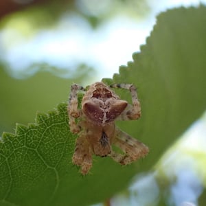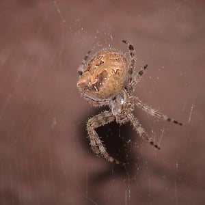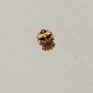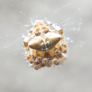 Araneus gemmoides, commonly known as the jewel spider (a name shared with Austracantha minax) and cat-faced spider (a name shared with Araneus gemma), is a common outdoor orb-weaver spider found in Canada and the USA. They are considered harmless and have low-toxicity venom. A. gemmoides are useful natural predators for insects. A. gemmoides make their webs near lights, closed spaces, and on the sides of buildings. They can also be found under wood, overhangs, or guarded places such as animal burrows. They come in varying colors but are easily identified by the two horn shaped growths on their relatively large abdomen. Their color changes from summer to winter. The female will die within days of laying a single egg sac with hundreds of eggs. Egg sacs can survive over winter, and the emerging spiderlings will eat their brothers and sisters. The babies ride strands of silk in warm air currents, able to transport them to locations miles away.