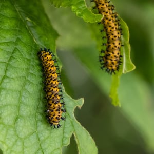 Like other members of the giant silk moth family, the cecropia moth lacks functional mouth parts and a digestive system. Due to this, they survive approximately two weeks. To find a mate, the female cecropia moth emits pheromones which the male detects with its sensitive antennae. Male cecropia moths can detect these pheromones from up to a mile away, although a male may fly up to 7 miles while searching for a female. Mating typically begins early in the morning hours and lasts until the evening. After mating, the female will lay up to one hundred eggs. These eggs are a mottled reddish brown and are usually found on either side of a host leaf. These eggs will eventually hatch into tiny black caterpillars. There are typically five larval instars (developmental stages), each lasting approximately one week. The first instar larvae are black. Their coloration is due to small black hairs growing from tubercles (small projections) all over their body. These larvae feed upon many common trees and shrubs including maple, birch, and apple. As the caterpillars grow larger into the second larval instar, they become yellow green. During the third, fourth, and fifth instars, the cecropia moth becomes rather large and bluish green. At these final stages, the tubercles become blue, yellow or orange, depending on location on the body, while the black hairs are eventually lost. The caterpillars reach maturity in autumn and are about 4 to 4.5 in long. Once the caterpillars reach maturity, they spin large brown cocoons longways on trees or wooden structures. They will then emerge as adults in the first two weeks of seasonally warm weather in early summer. Hyalophora cecropia moths are univoltine, having only one generation per year. Upon reaching adulthood, their size is variable. They are usually quite large, with a wingspan of about 5 to 7 in. The cecropia moth's wings are brownish with red near the base of the forewing. There are crescent-shaped spots of red with whitish centers on all wings, but are larger on the hindwings. All wings have whitish coloration followed by reddish bands of shading beyond the postmedial line that runs longitudinally down the center of all four wings. The body is hairy, with reddish coloring on the anterior, and fading to reddish/whitish. The abdomen has alternating bands of red and white.
