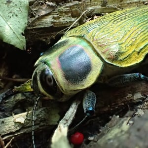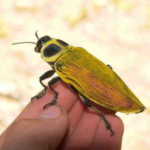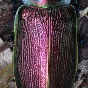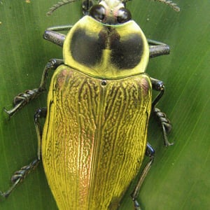 Euchroma gigantea is one of the largest of the buprestid beetles (hence the Latin name "gigantea" of the species), reaching a length of about 50–80 millimetres (2.0–3.1 in).Catoxantha and Megaloxantha are among the few other members of the family that reach a comparable size.The body of E. gigantea is robust and elongated and the elytra have a wrinkled surface and a metallic green colour with reddish or purplish tinges. The pronotum has a dark spot on each side. The larvae reach a length of about 12–15 centimetres (4.7–5.9 in). The elytra of newly emerged adults have a coating of a yellowish, waxy powder. As the beetle ages this powder wear off.