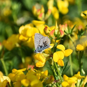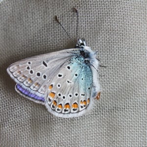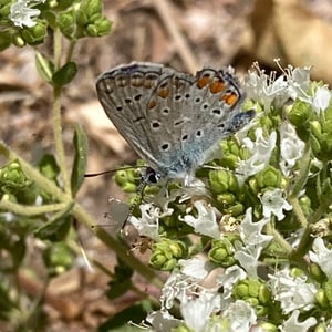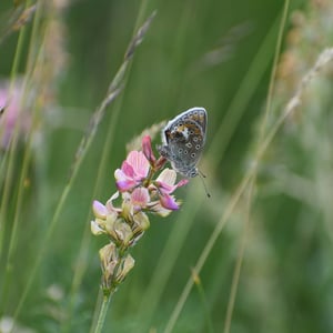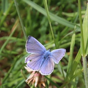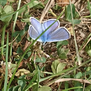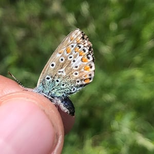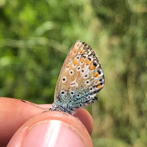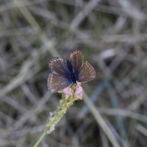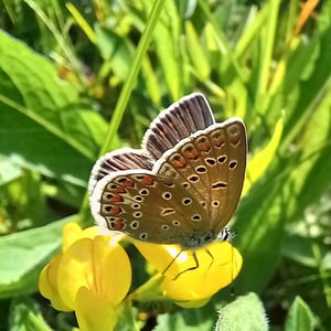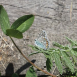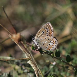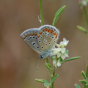 Polyommatus thersites, the Chapman's blue, is a butterfly in the family Lycaenidae. It is found in southern Europe, Morocco, Lebanon, Asia Minor, Iran and across the Palearctic to Siberia and Tian Shan. It is a small butterfly with both generation dimorphism and sexual dimorphism. For the first generation the upperside is blue with grey hind-wings and in the female a sub-marginal line of orange spots. The summer generation of the female is brown with the same sub-marginal line of orange spots while they are absent in the lighter male. Representatives of both sexes have in the spring generation grey-colored hindwing undersides while (sandy brown in the summer generation). The underside is ochre marked with black dots circled in white and decorated with a sub-marginal line of orange spots. The forewing underside is yellow grey in summer females. Polyommatus thersites is similar to Polyommatus icarus, but they are smaller and both sexes have no basal spots on the underside of the forewing. The larva feeds on Onobrychis species (O. arenaria, O. peduncularis, O. sativa and O. viciifolia)