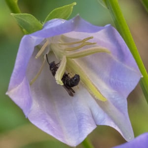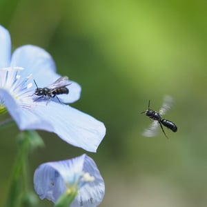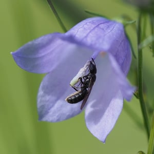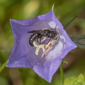 Chelostoma distinctum is a species of solitary bee commonly found in Europe. It is characterized by its distinct appearance, with a shiny black body and vibrant yellow markings on its abdomen. These bees are known for their specialized nesting behavior, constructing nests in pre-existing cavities such as hollow plant stems or beetle tunnels. Chelostoma distinctum plays an important role in pollination, particularly of plants in the Asteraceae family.