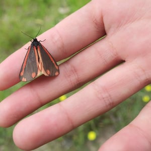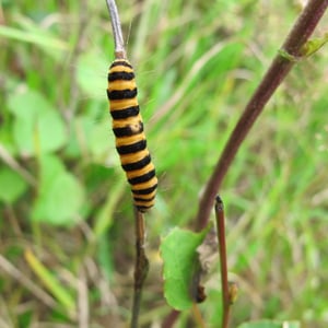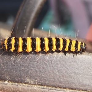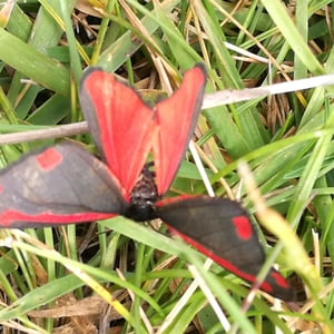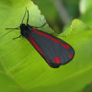 The cinnabar moth (Tyria jacobaeae) is a brightly coloured arctiid moth found as a native species in Europe and western and central Asia then east across the Palearctic to Siberia to China. It has been introduced into New Zealand, Australia and North America to control ragwort, on which its larvae feed. The moth is named after the red mineral cinnabar because of the red patches on its predominantly black wings. The species was first described by Carl Linnaeus in his 1758 10th edition of Systema Naturae. Cinnabar moths are about 20 mm long and have a wingspan of 32 –. Cinnabar moths are day-flying insects with distinctive pinkish-red and black wings. There is little variation in patterning, although on rare occasions the red markings may be replaced with yellow, or the forewing is entirely red with a black border, or the wings are completely black. Like many other brightly coloured moths, it is unpalatable; the larvae use members of the genus Senecio as food plants. Many members of the genus have been recorded as food plants, but of New World Senecio and Packera species, long-term population success has only been confirmed on the North American native plant Senecio triangularis. Other plant species, such as groundsel, are sometimes used, but larval and population survival tends to be reduced. Newly hatched larvae feed from the underneath of ragwort leaves within the area of their old eggs. The larvae absorb toxic and bitter tasting alkaloid substances from the food plants, and assimilate them, becoming unpalatable themselves. The bright colours of both the larvae and the moths act as warning signs, so they are seldom eaten by predators. An exception is among different species of cuckoo which eat hairy and poisonous caterpillars including cinnabar moth larvae. Females can lay up to 300 eggs, usually in batches of 30 to 60 on the underside of ragwort leaves. When the caterpillars (larvae) hatch they feed on and around the area of the hatched eggs but as they get bigger and moult (instars) they mainly feed on the leaves and flowers of the plant, and can be seen out in the open during the day. Like several other Arctiinae larvae, cinnabar caterpillars can turn cannibalistic. This is mainly due to lack of food, but they can eat other cinnabar larvae. Initially, the larvae are pale yellow, but later larval stages develop a jet-black and orange/yellow striped colouring. They can grow up to 30 mm, and are voracious eaters; large populations can strip entire patches of ragwort clean, a result of their low predation. Often, very few survive to the pupal stage, mainly due to them completely consuming the food source before reaching maturity; this could be a possible explanation for their tendency to engage in seemingly random cannibalistic behaviour, as many will die from starvation. Additionally, the larvae are preyed upon by species like the ants Formica polyctena.