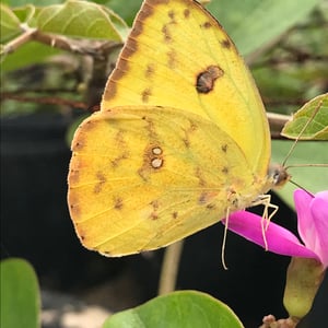 Phoebis sennae, the cloudless sulphur, is a mid-sized butterfly in the family Pieridae found in the Americas. There are several similar species such as the yellow angled-sulphur (Anteos maerula), which has angled wings, statira sulphur (Aphrissa statira), and other sulphurs, which are much smaller.