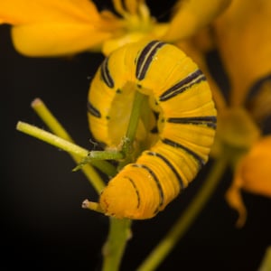 Once the egg hatches, a caterpillar emerges that is yellow to greenish, striped on sides, with black dots in rows across the back. The host plant may be partridge pea (Chamaecrista cinerea), sennas (Senna), clovers (Trifolium), or other legumes (Fabaceae). The caterpillar will usually grow to a length between 41 and 45 mm.
