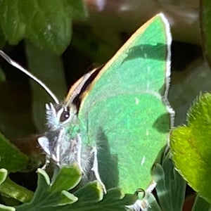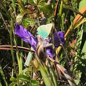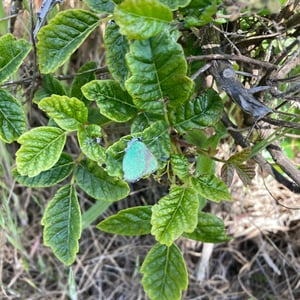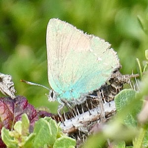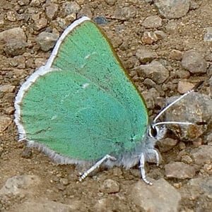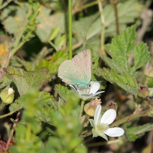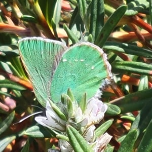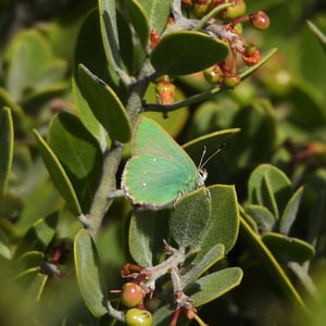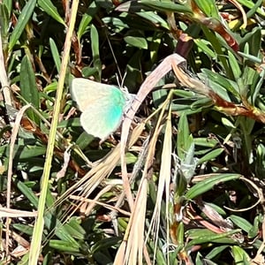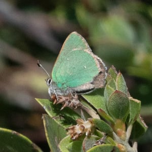 Callophrys dumetorum, the coastal green hairstreak, bramble green hairstreak, or bluish green hairstreak, is a butterfly of the family Lycaenidae. It is found in the United States in coastal California and rarely in inland California. Subspecies C. d. oregonensis is known as the Oregon green hairstreak. The wingspan is 25–32 mm. Adults are on wing from March to May in one generation. Larvae have been recorded on Lotus scoparius, Eriogonum fasciculatum, Eriogonum latifolium, and Eriogonum nudum. Adults feed on flower nectar from host plants. They also feed on buckwheats and desert parsley. Its habitats include open sites and clearings in Douglas-fir and ponderosa pine forests, road-cuts, and coastal dunes.