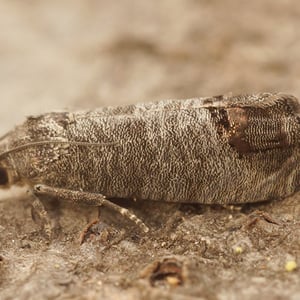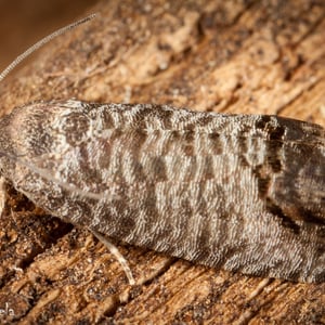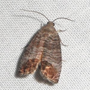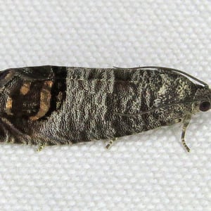 Codling moths are not large, as the full grown adult codling moth has an average length of 10 mm and wingspan of 20 mm. The wings fold into a tent-like shape when the moths are resting. They are distinguished from other similar moths in the family Tortricidae by the distinctive patterns on their fore-wings. These brown spots enclosed in gold rings are called "little mirrors" because they resemble small mirrors with a golden rim. The slender antennae are mildly curved near the distal end. The dorsal side of the abdomen is smooth and bare, while the ventral side is covered in scales. Though most of the moths are brown or gray in color, it has been observed that the maturity of the fruits the larvae feed on can lead to variation in color in the adult moth.