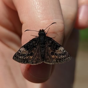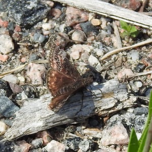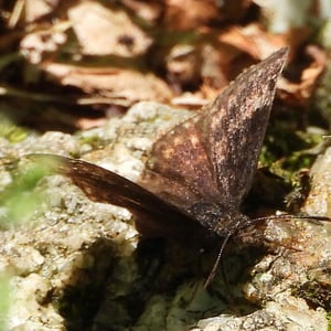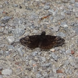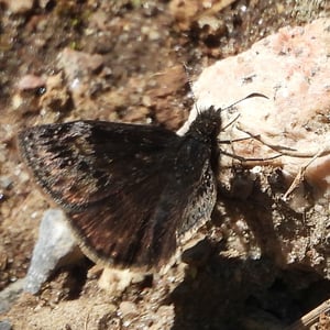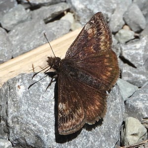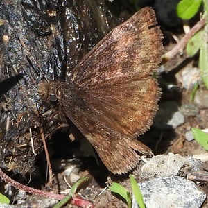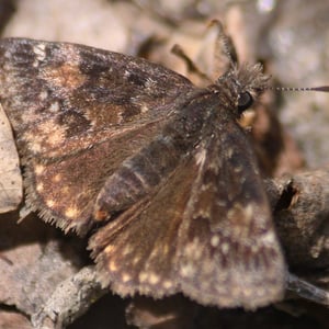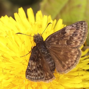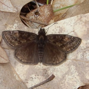 The Duskywing will appear in shades of brown. The underside of the hindwing has marginal spots. Males of the species have a costal fold containing yellow-colored "scent scales" to provide a sense of smell. Females of the species have their "scent scales" on the 7th abdominal segment.