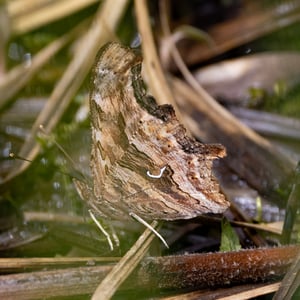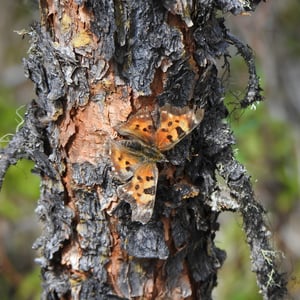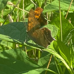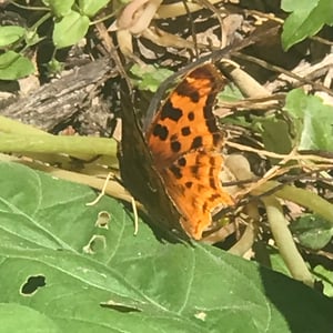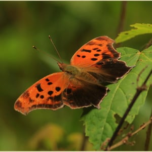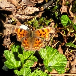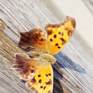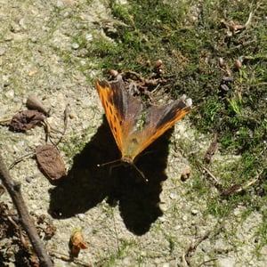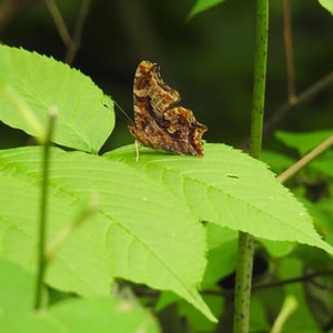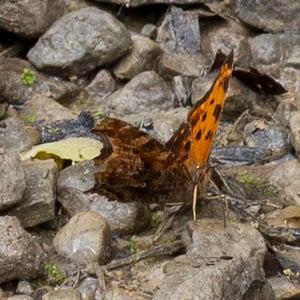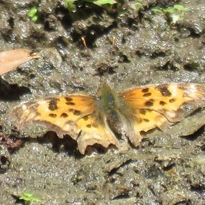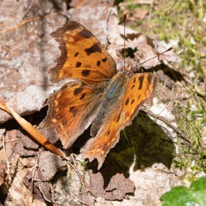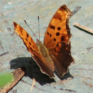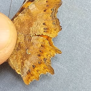 Polygonia (from Greek πολύς - polys, "many" and γωνία - gōnia, "angle" ) is a genus of butterflies with a conspicuous white mark on the underside of each hindwing, hence the common name comma. They also have conspicuous angular notches on the outer edges of their forewings, hence the other common name anglewing butterflies. The related genus Nymphalis also includes some anglewing species; Polygonia is sometimes classified as a subgenus of Nymphalis. Many members of Polygonia hibernate as adults. Species include: - Polygonia c-album (Linnaeus, 1758) – comma - Polygonia c-aureum (Linnaeus, 1758) – Asian comma - Polygonia comma (Harris, 1842) – eastern comma - Polygonia egea (Cramer, 1775) – southern comma - Polygonia faunus (Edwards, 1862) – Faunus anglewing, Faunus comma, green comma - Polygonia g-argenteum Doubleday & Hewitson, 1846 – Mexican anglewing - Polygonia gigantea (Leech, 1883) – giant comma - Polygonia gracilis (Grote & Robinson, 1867) – hoary comma - Polygonia haroldii Dewitz, 1877 – spotless anglewing - Polygonia interposita (Staudinger, 1881) - Polygonia interrogationis (Fabricius, 1798) – question mark - Polygonia oreas (Edwards, 1869) – oreas anglewing, oreas comma, sylvan anglewing - Polygonia progne (Cramer, 1775) – grey comma, gray comma - Polygonia satyrus (Edwards, 1869) – satyr anglewing, satyr comma - Polygonia undina (Grum-Grshimailo, 1890) - Polygonia zephyrus (Edwards, 1870) – zephyr comma