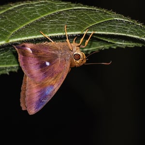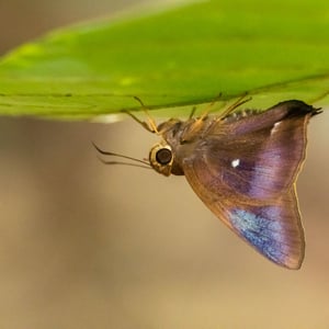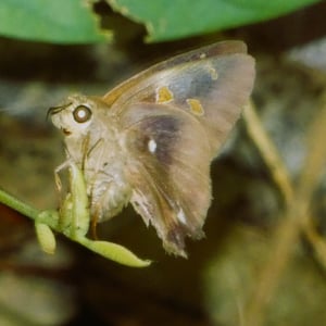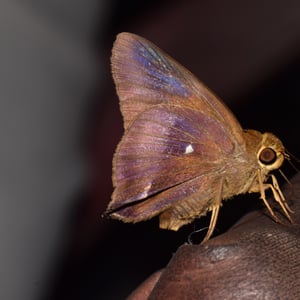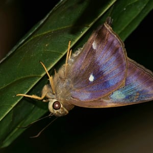 Edward Yerbury Watson (1891) gives a detailed description, shown below: "Male and female yellowish brown.Male, with a suffused blackish subbasal patch; forewing with three conjugated very small yellowish semitransparent spots near the costa, one fourth from the apex. Cilia pale greyish brown. Underside brown suffused with purple; forewing with a blackish costal patch before the apex, posterior margin yellowish; hindwing with a subbasal and submarginal suffused blackish band, the latter terminating in a black patch on anal lobe; above the patch is a purple-white streak, and within the cell a small bluish white spot. Palpi and body beneath dull yellow. Legs, pale brown. Female, above brown suffused with vinaceous yellowish brown basally; forewing with the three small subapical spots (as in male) and three rather large obliquely quadrate spots, two being disposed on the disc, the third above and within the cell. Underside with the spots on forewing as in upperside; hindwing as in male."