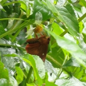The butterfly, which has a wingspan of 50 to 55 mm, is unmarked dark brown above. It resembles the common banded awl (Hasora chromus), except that it has no white band below; and the apex of the forewing and the disc of the hindwing below are purple washed. The male has apical spots but no brands above. The female has large yellow spots in cell 2 and 3, and apical dots. The Sri Lankan race has no apical spots on the male above and no purple wash below.