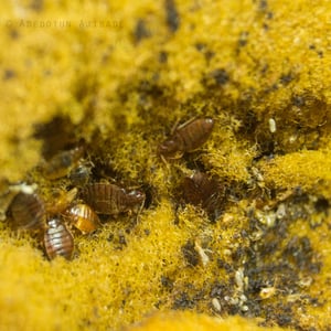 If feeding regularly, a female bed bug can lay between two and three eggs per day throughout her adult lifetime, which may last several months, allowing one female to produce hundreds of offspring under optimal conditions. The tiny (<1 mm) yellowish-white eggs are vase-shaped, and are laid within harborages where the insects rest between blood meals and spend virtually all of their time: although parasitic, they do not reside on their hosts and only contact them briefly for blood meals. Eggs typically hatch within 10 days at room temperature, but become non-viable below 14 C. Cimex lectularius goes through five immature life stages that each require a blood meal to develop and move on to the next stage. The life cycle occurs more rapidly at warmer temperatures, and more slowly at lower ones. Once the egg hatches, the larval form must take one blood meal per week as it completes each of its five to six molts. Once it completes the final molt, it will have reached the adult stage and can reproduce. Meals take several minutes to consume, and occur only under the correct conditions: darkness, warmth, and carbon dioxide. C. lectularius typically feed on hosts when they are asleep, they tend to feed exclusively on humans, and are obligate blood feeders. Newly hatched nymphs must consume a blood meal within two to three days or will die of starvation, whereas an adult can live for as long as six months between feedings.