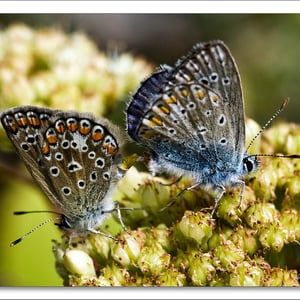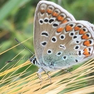 The common blue butterfly or European common blue (Polyommatus icarus) is a butterfly in the family Lycaenidae and subfamily Polyommatinae. The butterfly is found throughout the Palearctic. Butterflies in the Polyommatinae are collectively called blues, from the coloring of the wings. Common blue males usually have wings that are blue above with a black-brown border and a white fringe. The females are usually brown above with a blue dusting and orange spots.