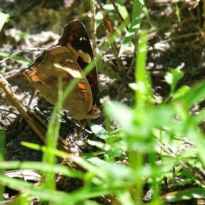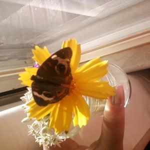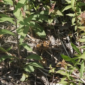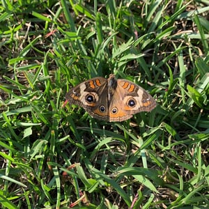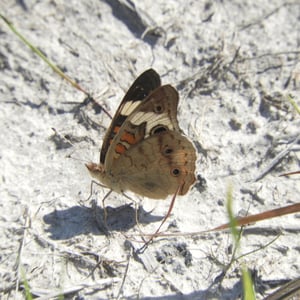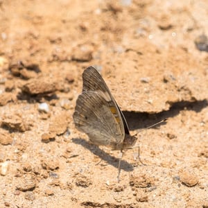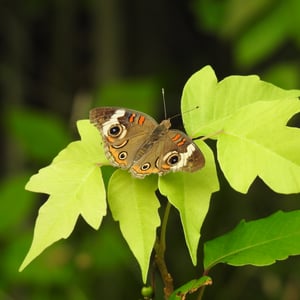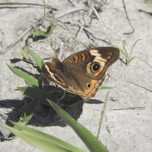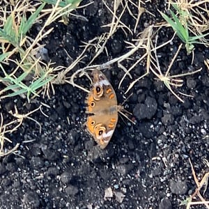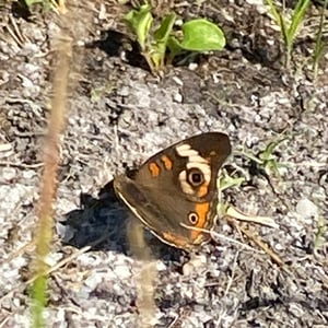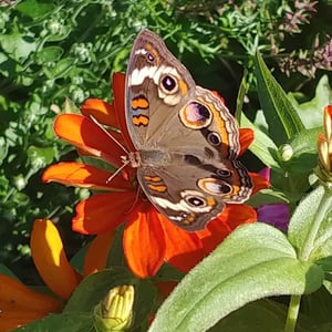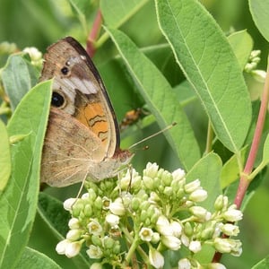 Junonia coenia, commonly known as the common buckeye, is a species of butterfly found in North and Central America. It has a wingspan of about 5-6 centimeters and displays a striking pattern of eyespots on its wings. The upper side of its wings is brown with orange and black markings, while the underside is lighter with intricate patterns. This species is known for its migratory behavior and can be found in a variety of habitats, including open fields, gardens, and meadows.