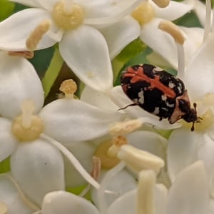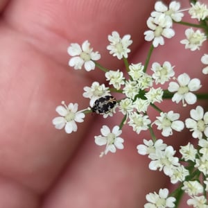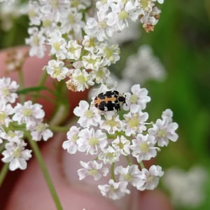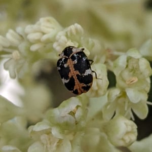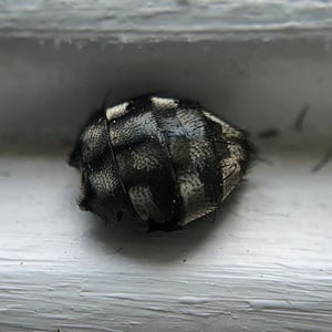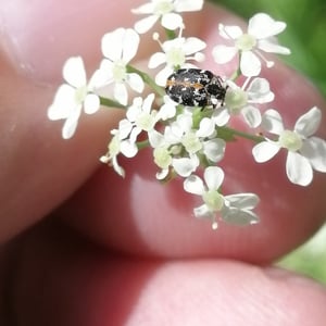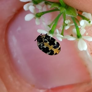Anthrenus scrophulariae, commonly known as the carpet beetle, is a small insect belonging to the family Dermestidae. It measures around 2-4 mm in length and has a distinctive oval-shaped body covered in colorful scales. The larvae of Anthrenus scrophulariae are known to be destructive pests, feeding on a variety of organic materials such as carpets, upholstery, and clothing. Adult carpet beetles, on the other hand, primarily feed on pollen and nectar.