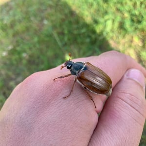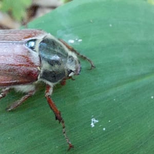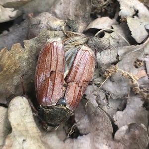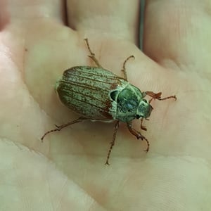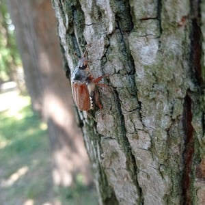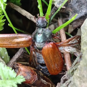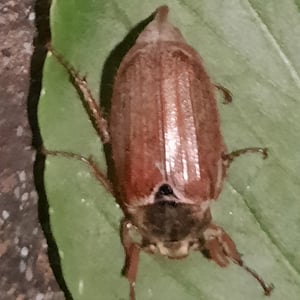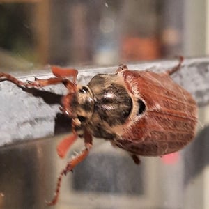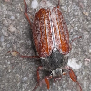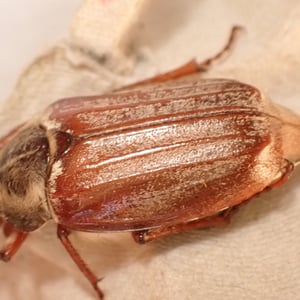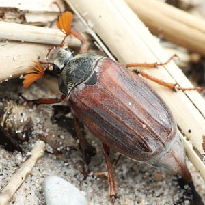 Melolontha melolontha, commonly known as the European cockchafer or May bug, is a large beetle belonging to the family Scarabaeidae. It is approximately 2-3 centimeters long and has a robust body with a reddish-brown color. The adult beetles are active during the spring and early summer months, often being attracted to lights at night. The larvae, known as white grubs, are considered pests as they feed on the roots of various plants, causing damage to crops and lawns.