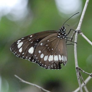 Due to its inedibility, Euploea core is mimicked by a few edible species. Additionally a number of other inedible species within the same family mimic each other forming a Mullerian ring. The edible species are contained in the two families: Distribution also plays a role in telling the species apart. Both Papilionids are forest dwellers and while the common mime is distributed in all forested areas in India, the Malabar raven is endemic to the Western Ghats south of Goa. The inedible species are in the same genus forming a Mullerian ring Both these species differ in the number and size of brand and allied streak in the female, which can only be examined if the specimen is caught and closely examined. The double branded crow has two brands and the female has two white streaks on the underside. The brown king crow has a broad brand and the female has a short indistinct white streak on the underside - Papilionidae - Malabar raven (Papilio dravidarum), common mime (Papilio clytia) form clytia - Nymphalidae - great eggfly (Hypolimnas bolina) female, Ceylon palmfly, Elymnias singala male and female - Brown king crow (E. klugii) - Double branded crow (E. sylvester)