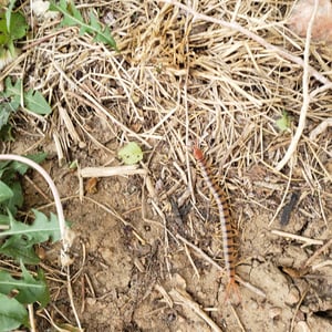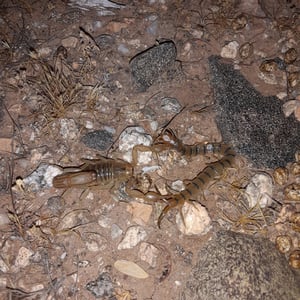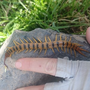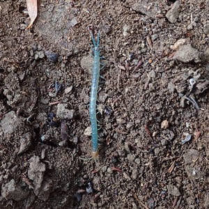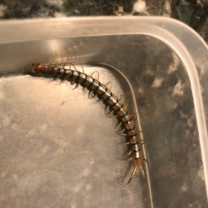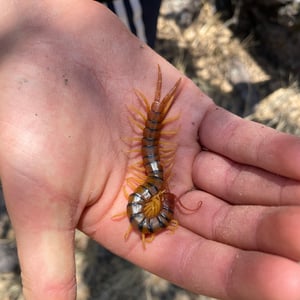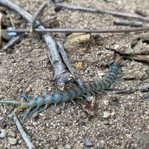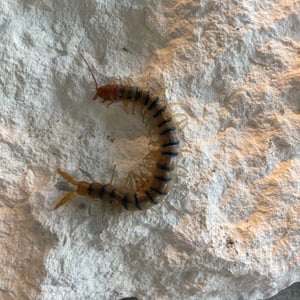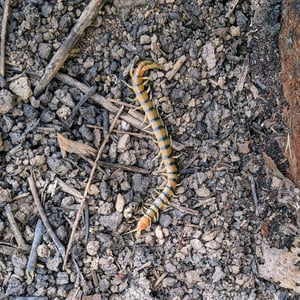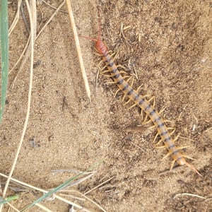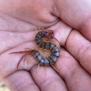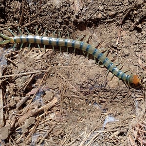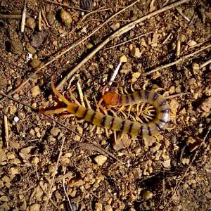 Scolopendra polymorpha, the common desert centipede, tiger centipede, banded desert centipede, or Sonoran Desert centipede, is indigenous to the Southwestern United States and northern Mexico, north to the Pacific coast. It inhabits dry grasslands, forest, and desert; in these habitats, the centipedes generally take up residence under rocks, though they have been observed creating burrows in suitable environments and inside rotting logs. Their bodies generally reach 4 - 7 in in length. Coloration is variable, hence the species name polymorpha which means "many forms", and alternative common names like "multicolored centipede". The body segments have one dark lateral stripe, so they are also known as the tiger centipede or tiger-striped centipede. Generally, this species has a darker brown-, red-, or orange-colored head and lighter brown, tan, or orange body segments with yellow legs. However, some populations, such as those in Southern California, may be entirely light blue with indigo stripes, with turquoise legs. Its antennae have seven or more smooth segments.