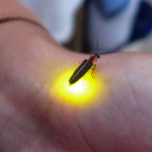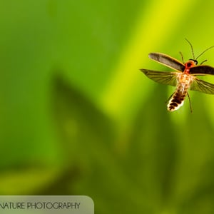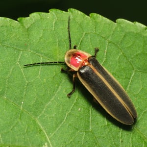 Males are the first to start the series of patrolling flashes needed to locate and mate with a female. Males will actively fly while flashing, whereas females are sedentary. They will flash every 6 seconds and wait for a responding flash from the female, which comes after a 1-2 second delay It has been shown that females only respond to their conspecific males; identifying them by the color of their yellow bioluminescent flash, in combination with the temporal patterning, duration and intensity of the male flash. Females will twist their abdomen towards the males flash, presenting their own flash toward the male. Males can be observed flying in a nearly vertical orientation; their antennae held forward and stiff while their legs are held toward the body during patrolling. They also show an obvious gaze shift towards the last female flash, and continue towards it until the female firefly flashes again. The flashes continue until the male reaches the female. Males congregate in large masses and it is most likely that more than one will find the same female; in this case male P. pyralis display aggression towards one another while not in flight.During the “aggression” stage, males with smaller elytra and smaller lanterns are favored; whereas during the signaling phase, males with longer elytra and bigger lanterns are favoured. Males with larger lanterns are favored in signaling phases of courtship because their broadcasting flashes can be seen by females who are further away, it is also suggested that due to their longer elytra these males may also have an advantage of finding the females faster.Photinus fireflies do not feed as adults and therefore males are better able to attract females by offering nuptial food gifts, in the form of spermatophores which females can use to provide nutrients to their eggs.