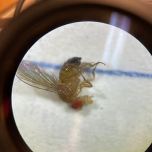Genetic markers are commonly used in Drosophila research, for example within balancer chromosomes or P-element inserts, and most phenotypes are easily identifiable either with the naked eye or under a microscope. In the list of a few common markers below, the allele symbol is followed by the name of the gene affected and a description of its phenotype. (Note: Recessive alleles are in lower case, while dominant alleles are capitalised.) - Cy1: Curly; the wings curve away from the body, flight may be somewhat impaired - e1: Ebony; black body and wings (heterozygotes are also visibly darker than wild type) - Sb1: Stubble; bristles are shorter and thicker than wild type - w1: White; eyes lack pigmentation and appear white - bw: Brown; eye color determined by various pigments combined. - y1: Yellow; body pigmentation and wings appear yellow, the fly analog of albinism
