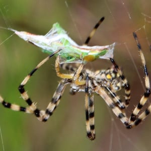 Like most orb-web spiders, A. australis shows considerable sexual size dimorphism; females (~25mm) are considerably larger than males (~6mm). When viewed from above, the abdomen is bright yellow with black cross-wise stripes and has an obvious knobby outline. When viewed from below the body is more finely detailed, and appears more black with patterns of yellowish spots and lines arranged symmetrically along the longitudinal axis. The legs have alternating bands of light (e.g. white, orange, yellow) and dark (brown, black) color.
