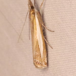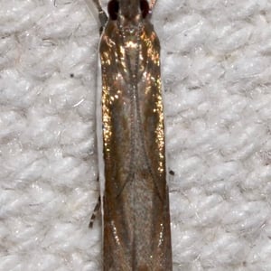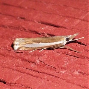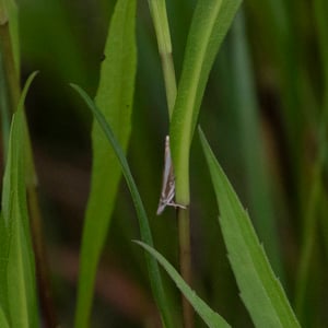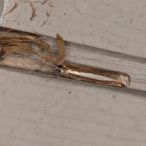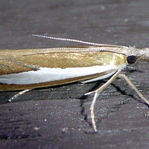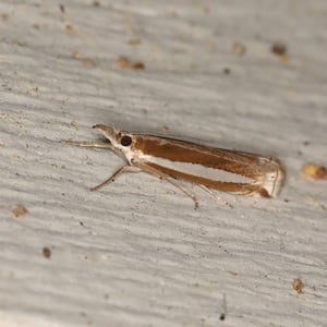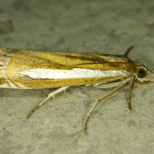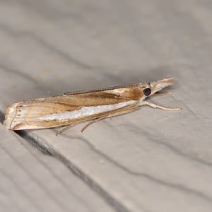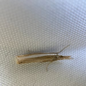 Crambus praefectellus is a small moth belonging to the family Crambidae. It has a wingspan of about 15-20 mm and is commonly found in grassy habitats across North America. The adult moth has a pale brown coloration with intricate patterns on its wings, while the larvae feed on grasses and other herbaceous plants. This species is known for its ability to blend in with its surroundings, making it difficult to spot in the wild.