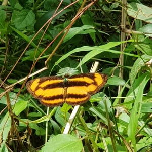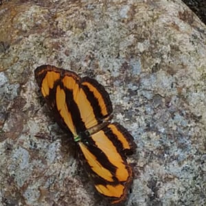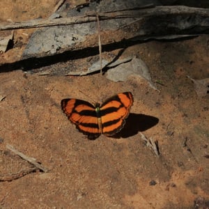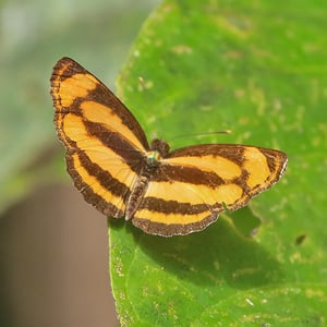 Males and females are similar to the wet-season form, but the markings are very much broader; on the upperside of the forewing the postdiscal line generally and the subterminal line always clearly defined, the former sometimes like the latter, orange-yellow, Underside paler, the markings more blurred, the transverse short brown striae in many specimens covering nearly the whole surface of the wings. Expanse: 38–44 mm Race sinuata Moore (restricted to Sri Lanka) is a slightly differentiated island form. It differs constantly from the typical form in the margins of the discal markings (especially the outer margins) on the upperside of the forewing and the margins of the subbasal and postdiscal bands of the hindwing being more sinuous.