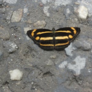 Both male and female have upperside black with orange markings. Forewing: discoidal streak broad, anteriorly twice indented, at apex extending into base of interspace 3; posterior discal spots coalescent, forming an irregular oblique short broad band; anterior spots also coalescent, oblique from costa; a postdiscal obscure grey incurved transverse line, and a very slender, also obscure, orange transverse subterminal line. Hindwing: a subbasal transverse broad band, and a much narrower postdiscal band curved inwards at the ends; beyond this the black terminal margin is traversed by a darker black subterminal line. Underside chestnut-brown, covered with short, slender, transverse brown striae on the margin of the orange markings, which are similar to those on the upperside but broader, paler, and less clearly defined. Forewing: the pale transverse postdiscal and orange subterminal lines of the upperside replaced by a postdiscal lilacine narrow band, defined by somewhat crenulate chestnut-brown lines on each side, and a pale subterminal line. Hindwing: the base suffused with lilacine; the subbasal and postdiscal bands bordered outwardly by narrow lilacine bands, the orange-yellow of the postdiscal band much obscured by the transverse brown strife; the terminal margin with a sinuous obscure broad lilacine line. Antennae, head, thorax and abdomen black; beneath, the palpi and thorax greyish, abdomen ochraceous.
