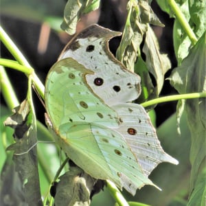 The following description is for P. p. aethiops: A large butterfly; the wingspan is 65–80 mm for males and 75–90 mm for females. The male and female are similar in colour and pattern. The base colour of the upper surface of the wings is greenish white with a violet sheen in the wet-season form, and pearly white in the dry-season form. The forewing has a black-tipped, hooked apex. The wings have a few red eyespots which are ringed with black. There are black spots near the margins of both the forewings and hindwings. The underside of the wings has a greenish-white base colour, with eyespots corresponding to those on the upper surface.