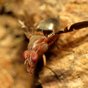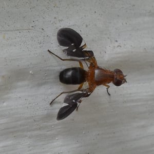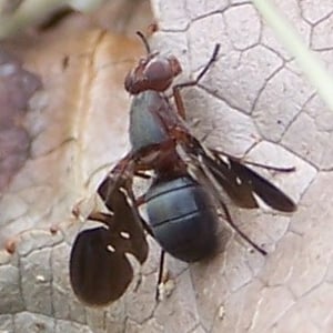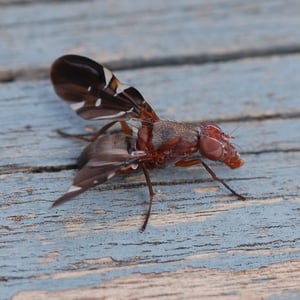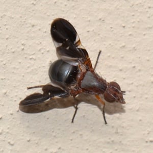 Delphinia picta is a species of picture-winged fly in the family Ulidiidae. The specific name picta is from Latin and means "painted." It is the only species in the monospecific genus Delphinia. It is found in the United States on the East Coast and in the Midwest from Florida to Maine across to Kansas through Minnesota but also can be found in Mexico and El Salvador. It is sometimes mistaken for a species of fruit fly, but D. picta do not feed on living plant matter, as they are detritivores and eat decaying plant matter. They also have been observed eating fermenting frass from Megacyllene robiniae on black locust trees. They can be found almost anywhere there is decaying vegetation: landfills, temperate deciduous forests, swamps, and even shaded fields.