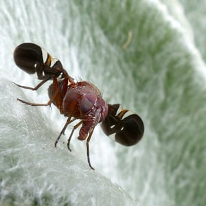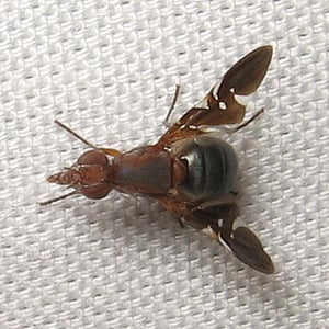 The best way to identify the species is by the distinct pattern on its wings, which are shiny and dark brown with a hyaline background. Its body is about 7mm long with a black abdomen and a light brown head, thorax, and legs. The ovipositor averages 1.27mm long with two dorsal and one ventral prominent pairs of setae, as well as many short setae on both sides. The tip of the ovipositor also has a slight bend downward.