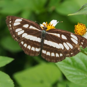 Neptis hylas, the common sailor, is a species of nymphalid butterfly found in the Indian subcontinent and southeast Asia. It has a characteristic stiff gliding flight achieved by short and shallow wingbeats just above the horizontal.