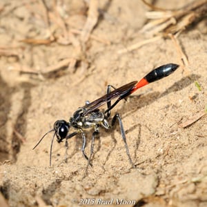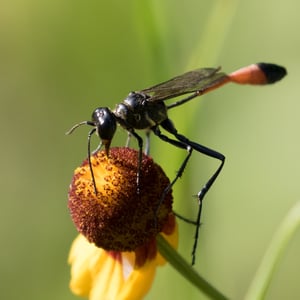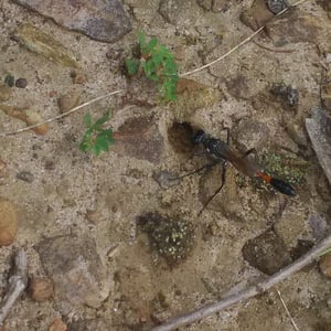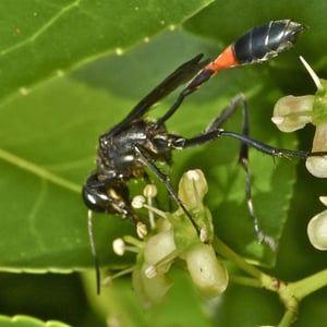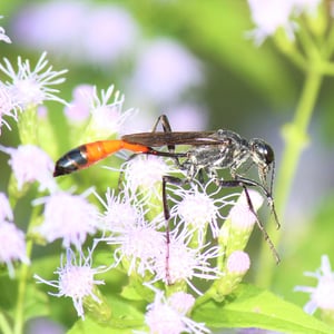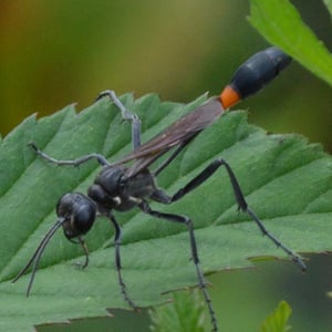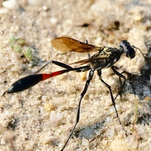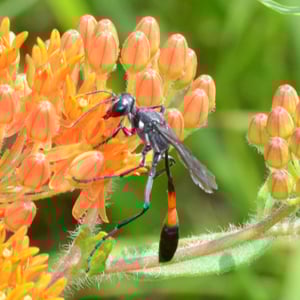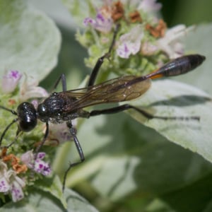 Ammophila procera, the common thread-waisted wasp, is a species of thread-waisted wasp in the family Sphecidae. It is a common species, found in southern Canada, the United States, and Mexico, and south to Central America.Ammophila procera generally live in open areas with soft or sandy soil where they can burrow nests. The adult female digs a burrow. After completing the burrow, it seals the entrance and makes flight around the area, memorizing landmarks such as rocks, plants, etc. It uses these landmarks to locate the burrow when it returns, sometimes days later.It then captures and paralyzes prey, usually a moth caterpillar or sawfly larva, and drags it to the burrows where it lays a single egg on the prey. The female then seals the nest with dirt and debris. Despite sealing the nest, some females will "hijack" another's nest, replacing the egg in the nest with their own.The egg typically hatches after two days, and the larva feeds on the caterpillar for about five days before it pupates within the nest. It emerges from the nest with fully formed wings. The adults feed primarily on flower nectar.